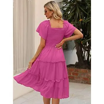 LILLUSORY Spring Midi Graduation Bridal Baby Shower Dresses Women 2024 Summer Casual Flowy Bridal Sun Sundress Trendy Brunch Cute Ladies Vacation Smocked Teacher Clothes Outfits Hot Pink