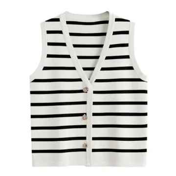 LILLUSORY Vest Tops for Women Striped Sweater Vest 2025 Summer Crochet Cropped Button Up Work Tank Top Outfits Clothes WhiteBlack S