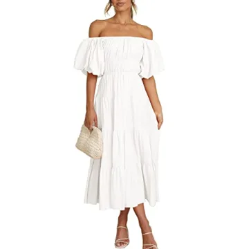 Show more Step into effortless style with the LILLUSORY White Sundresses, designed specifically for the modern woman with an eye for elegance and trend. This stunning off-the-shoulder dress combines a flowy boho midi design with a smocked bodice, making it perfect for a variety of occasions including bridal showers and graduations. Crafted with a soft yet heavyweight fabric, it drapes beautifully on any figure, ensuring you feel as fabulous as you look. Whether paired with sandals for a summer day or dressed up with heels for an evening event, this dress promises to become a staple in your wardrobe. Its chic puff sleeves and flowing silhouette create a graceful look that embodies feminine charm.