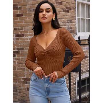 LILLUSORY Women's 2025 Twist Knot Fall Clothes Fashion Outfits Top Ribbed Long Sleeve 2025 Caramel Small