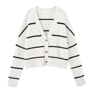 LILLUSORY Women's Cropped Cardigan Oversized Button Sweaters 2025 Fall Trendy Knit Dressy Fashion Outfits Stripes White L