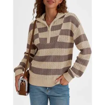 LILLUSORY Women's Quarter Zip Pullover V Neck Crochet Striped Sweater 2025 Cotton Color Block Trendy Knit Tops