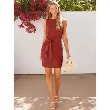 LILLUSORY Women Summer Tie Wrap Tank Short Mini Tshirt Dresses 2025 Trendy Spring Sun Vacation Outfits Casual Work Cute Bodycon Ruched Little T Shirt Sundress Clothes Brick Red M