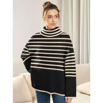 LILLUSORY Womens Fall Turtle Neck Long Sleeve Sweaters Ribbed Knit Pullover Top with Slit Fall Outfits Clothes Fashion 2024 Black-Apricot Small