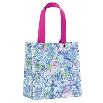 Show more Introducing the fabulous reusable market bag from Lilly Pulitzer, designed to elevate your shopping experience while being eco-friendly. The bag measures an impressive **13.5 inches (W) x 8 inches (D) x 14 inches (H)**, providing ample space for all your essentials. Crafted from **high-quality all-weather woven polypropylene**, this lightweight yet heavy-duty material is not only **water and tear-resistant** but also foldable for easy storage, ensuring that it's the perfect companion for every outing.