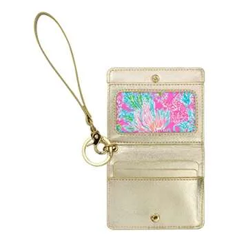 Not only is this wristlet wallet designed for practicality, but it also exudes charm with its striking pink and blue pattern, aptly named Seaing Things. The addition of a gleaming gold metal Lilly logo plaque adds a touch of elegance, ensuring it stands out as the perfect accessory for any outfit, regardless of age.
