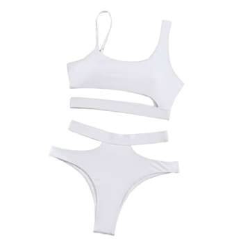 Lilosy Cutout Shoulders High Waisted Cut Leg Thong Brazilian Bikini Swimsuit Set Women Cheeky Bottom Bathing Suit 2 Piece Out White Large