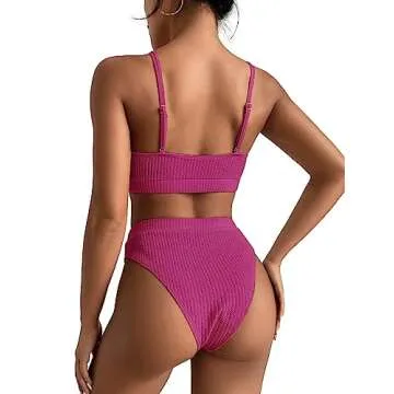 Lilosy High Waisted Tummy Control Bikini Ribbed Sporty Brazilian Swimsuit Set Women Highwaisted Cheeky Cut Leg Rise Bottom Crop Push Up Top 2 Piece Bathing Suit Neon Hot Pink Medium