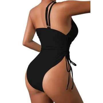 Lilosy Plus Size Sexy One Shoulder Tummy Control One Piece Swimsuit Ruched High Cut Leg Rise Cutout Thong Cheeky Brazilian Bathing Suit Women Drawstring String Tie Side Monokini Black 2# Large