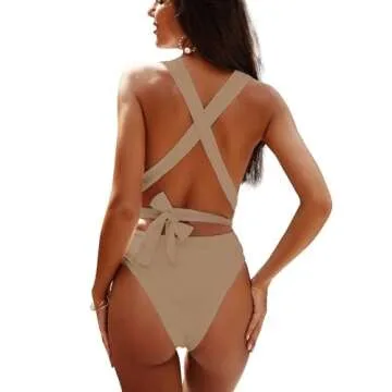Lilosy Sexy Lace Up Plunge Neck Backless High Waisted Low Cut Leg Rise Thong Cheeky Brazilian 1 Piece Bikini Swimsuit Women Back Bathing Suit Tie Criss Cross Monokini Khaki Large