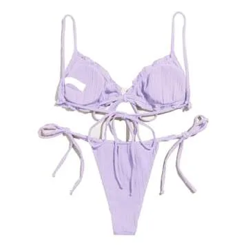 Show more Introducing the Lilosy Sexy Ribbed Ruffle G String Tie Triangle Thong Bikini Swimsuit Set, a must-have addition to your summer wardrobe. This stylish two-piece bathing suit is tailored for the modern woman, combining comfort with a daring design. Made from high-stretch fabric, it ensures a snug yet flexible fit, allowing you to enjoy your beach or pool day without any restrictions. The vibrant purple color adds a fun pop to your summer festivities, while the ribbed texture offers a touch of sophistication.