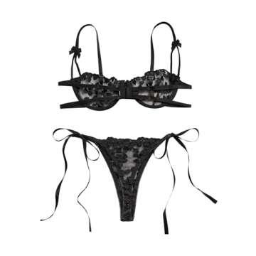 Lilosy Sexy Tie Side Cute Underwire Push Up Strappy Embroidered Mesh Sheer Lingerie Set