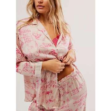 Show more Introducing the LILTWIST Pink Silk Western Cowgirl Pajamas for Women—a stunning and contemporary lounging essential perfect for every modern woman! This luxurious satin two-piece pajama set showcases a delightful floral print that encapsulates the essence of both style and comfort. Crafted from a premium polyester satin blend, these pajamas are exceptionally soft, lightweight, and breathable, making them an ideal choice for all-day relaxation. With a unique coquette aesthetic, the set features an oversized silhouette with a long-sleeve V-neck button-down shirt and matching wide-leg pants, ensuring you feel both chic and comfortable whether you're at home or on the go.