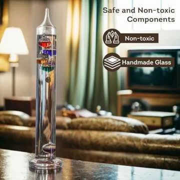 Safety is paramount with the Galileo Thermometer; every component is crafted from non-toxic and environmentally safe materials, including an inert oil-hydrocarbon mixture similar to mineral oil. The lab-grade glass ensures durability while maintaining its classic aesthetic. Whether displayed on a mantelpiece, desk, or in a sunlit room, this thermometer embodies a sense of sophistication.