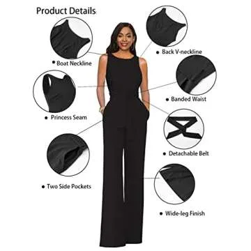Show moreIntroducing the **LILYIN Women’s Sleeveless Belted High Waist Wide Leg Jumpsuit with Pockets (M, Black)**—a versatile staple tailored to empower your fashion journey! This elegant jumpsuit is meticulously designed with an exquisite blend of style and comfort in mind. Featuring a chic **boat neckline** and sultry **deep V-back**, it transforms any outfit scenario from casual brunches to sophisticated dinner dates. The **fitted princess seams** and **banded waist** create a flattering silhouette that accentuates your shape, while the generous **side pockets** add a dash of practicality to this stunning look. Crafted from high-quality **stretch knit fabric**, it ensures a snug yet flexible fit that moves seamlessly with you throughout your day.