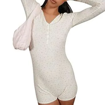LimbirTizes Women One Piece Jumpsuit Long Sleeve Floral Print Bodycon Shorts Romper Y2K Slim Fit Onesie Pajamas Bodysuit