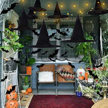 LINAYE Halloween Witches Hat XL Kit - 8 PCS Black Witch Hats with Hanging Rope,16 PCS 3D Bat,Spider Web,Creepy Cloth Halloween Hanging Decoration Wizard Hats Halloween Decorations Decor