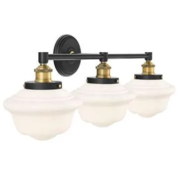 Show more Introducing the Linea di Liara Lavagna Farmhouse Matte Black Bathroom Light Fixtures, a perfect blend of vintage charm and modern elegance designed to enhance your bathroom decor. With its sleek matte black finish and antique gold accents, this stunning 3-light vanity light offers a warm, inviting glow while adding a touch of sophistication to any space. Installation is a breeze with the included 5.25" mounting plate, allowing you to hardwire this fixture either as an uplight or downlight over your mirror, providing versatility to your lighting needs. Designed with quality in mind, the solid body and beautiful milk glass schoolhouse shades (8" in diameter, 12" height) promise to elevate your bathroom aesthetics seamlessly.