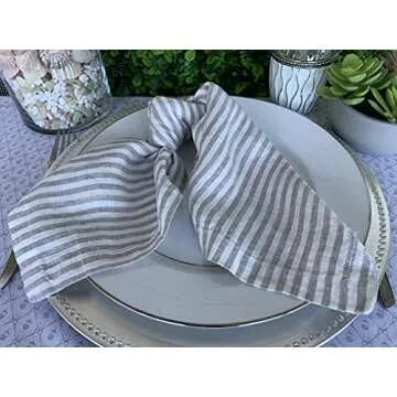 Linen Napkins – 100% French Flax – Stonewashed Pure Linen Cloth Napkins – Mitered Corners – Set of 4 (Gray/White Stripe)