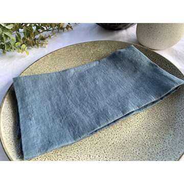 Show more Elevate your dining experience with our exquisite set of soft teal blue stonewashed French linen dinner napkins. These beautifully crafted napkins, measuring 18 x 18 inches, are a perfect blend of elegance and practicality, designed to add a touch of sophistication to both formal and informal tablesettings. Made from pure French flax, each piece boasts a luxuriously soft texture, complemented by meticulously matched stitching that enhances its aesthetic appeal.