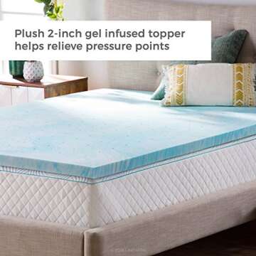 Show more Experience unparalleled comfort with our sensational gel-infused memory foam mattress topper that elevates your sleeping experience to a whole new level. Designed by a trusted brand, this topper features cooling gel infusions that promote optimal ventilation and breathability, ensuring a fresh and refreshing night's sleep. The plush gel-infused memory foam contours to your body's unique curves, providing personalized comfort that lovingly hugs you to sleep. Whether you're looking to rejuvenate an old mattress, soften a too-hard mattress, or simply prolong the life of your bed, this topper is your ideal solution.