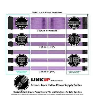 Show more Elevate your PC building experience with the high-quality, rugged LINKUP modular PSU cable extensions. Designed specifically for gamers and computer builders, these 18AWG multi-color cables provide the perfect blend of functionality and aesthetic appeal. With their unique braided cable design, they offer vibrant style and flexibility that easily adapts to your build's requirements. Tested with the RTX3090 GPU, you can be assured of their performance and reliability.