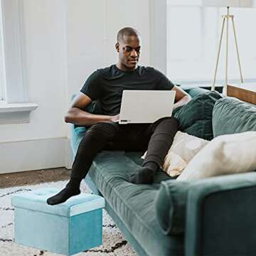 LINMAGCO 16" Small Velvet Ottoman with Storage | Collapsible Sturdy Rectangle Ottoman Foot Rest Under Desk Stool for Room Folding Ottoman Furniture with Button turfted-Lakeblue