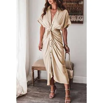 Linsery Women's Ruched Shirt Dress Sexy Short Sleeve Button Down Wrap Maxi Dress with Belt Apricot Small