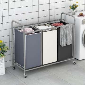 Show moreIntroducing the LINZINAR 3-Bag Laundry Basket Sorter, your ultimate solution for efficient laundry management and home organization. Crafted from high-quality non-woven fabric, this laundry cart ensures durability and ease of cleaning, making it a perfect addition to your household essentials. With a robust frame made from thickened reinforced round pipe, it boasts an impressive load-bearing capacity, allowing you to sort through your laundry with confidence. Measuring at 32.68L x 15.75W x 33.46H inches, this cart is designed to meet your varied sorting needs while adding a stylish touch to your living space.
