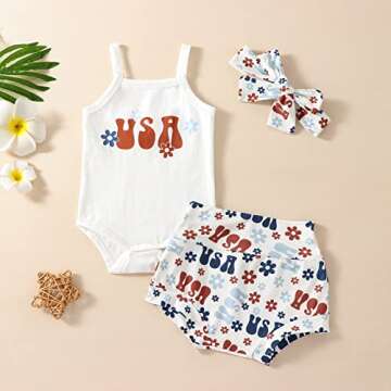 Show moreDress your little one in the ultimate summer style with the LIOMENGZI Newborn Infant 4th of July Baby Girl Outfits. This delightful ensemble combines charming aesthetics with practical features, making it an essential addition to your baby girl's wardrobe. Crafted from 100% cotton, these outfits are designed to be ultra-soft and ensure a comfortable fit that is gentle against delicate skin. The three-piece set includes a sweet flower print top and a pair of bloomers shorts, ideal for warm weather outings. The easy wear design allows your child to put on and take off the clothes independently, fostering their confidence and comfort while playing or lounging.