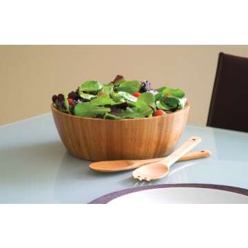 Lipper International 8208-3 Bamboo Wood Salad Bowl with Server Utensils, 11.75" Diameter x 4" High, 3-Piece Set