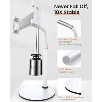 Show more The LISEN Tablet Stand Holder is a revolutionary accessory designed to elevate your tablet and smartphone experience. Made by the renowned brand LISEN, this versatile stand is perfect for anyone who regularly uses a tablet or smartphone for work, play, or communication. With its newly upgraded features, you can expect superior stability and durability. The robust all-metal rod and the strengthened metal silicone clip ensure that your device remains secure, while the thickened EVA pad on the base offers excellent support and prevents slipping.