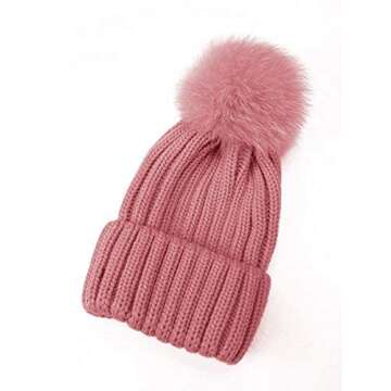 LITHER Women Winter Warm Pom Pom Beanie with Real Large Raccoon Fur Balls Winter Hats Pink