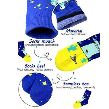 Show moreIntroducing the LITTLE FLY BIRD Boys Fun Novelty Crazy Pattern Seamless Combed Cotton Crew Dress Socks - a delightful trio of vibrant crew socks designed especially for boys aged 5-7 years old. Crafted from high-quality combed cotton, these socks provide an unparalleled experience of comfort and durability, making them perfect for active youngsters. The fun space-themed designs featuring colorful cartoon patterns are loved by kids, ensuring that they will want to wear them every day! Say goodbye to discomfort with the seamless toe construction, which guarantees a smooth fit and prevents any annoying rubbing or irritation, allowing your child to play freely and happily.