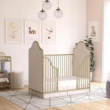 Show moreIntroducing the Little Seeds Piper Upholstered Metal Crib in Gold, a stunning addition to your nursery that artfully blends functionality with exquisite design. This modern 2-in-1 convertible baby crib offers a warm and welcoming environment, perfect for both baby boys and girls. With the versatility to transform from a crib into a toddler bed (conversion kit sold separately), it truly grows with your child, making it a smart investment for years to come. The elegant design features curved silhouettes with camelback-shaped side panels, all upholstered in soft faux velvet, ensuring both comfort and style in your little one's room.
