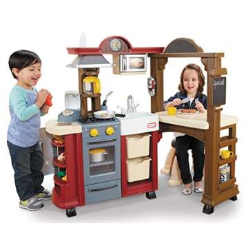 Show moreStep into the delightful world of culinary creativity with the Little Tikes Kitchen & Restaurant-Red – an Amazon Exclusive designed to inspire budding chefs and restaurateurs! This multifunctional playset effortlessly transforms from a bustling kitchen into a charming restaurant, providing an immersive experience that fuels imagination and social interaction. When fully expanded, kids enjoy a spacious, full-size kitchen with all the tools they need to whip up delicious meals, while folding it to a 90-degree angle converts it into a cozy dining space where they can serve their friends and family. Crafted for durability and fun, this vibrant playset features a fun panini grill that steams and sizzles just like the real thing, ensuring endless hours of engaging play.