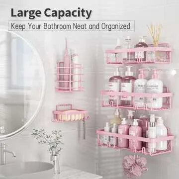 Show more If you’re tired of cluttered bathroom counters and want a neat and organized space, the Liuoud Shower Caddy 5 Pack is your perfect solution. This innovative bathroom shower organizer is designed to meet all your storage needs with style. Coming in a delightful Pink, this set includes three spacious shower caddies, a soap holder, and a toothbrush holder, making it an all-encompassing solution for neatly storing your bath essentials. The design incorporates durable stainless steel constructed with a high-heat paint process, ensuring longevity in a humid environment.