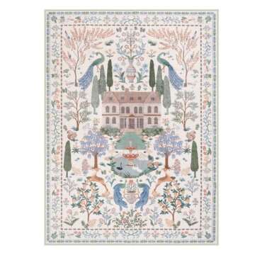 Transform your home with the stunning LIVEBOX Washable Rug, a beautiful 8x10 area rug that perfectly blends elegance with practical functionality. This exquisite piece showcases whimsical floral patterns inspired by classic French medieval designs, featuring exotic mid-century courtyards, vibrant plants, serene fountains, and lively birds. The soft beige hue of the rug effortlessly enriches your living space and enhances the decor of any room, making it an ideal centerpiece for your living...
