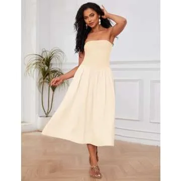 Livtany Women Off Shoulder Midi Dress Strapless Sleeveless Drop-Waist A Line Tube Dress Trendy Summer Swing Patchwork Dress Beige