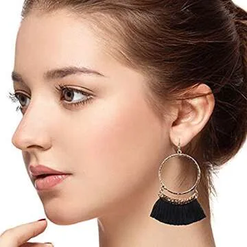 Livtor Fan Tassel Earrings Hoop Drop Dangle Earrings Fish Hook Earring for Daily Wear, Wedding, Party etc(Black)
