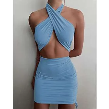 Lizstud Women Sexy Club Halter Criss Cross Hollow Out Ruched Sleeveless Mini Bodycon Dresses Light Blue