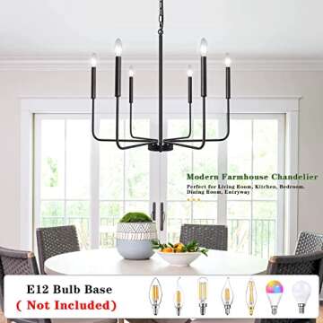 The chandelier uses 6 E12 base bulbs, compatible with LED, CFL, halogen, or incandescent options.