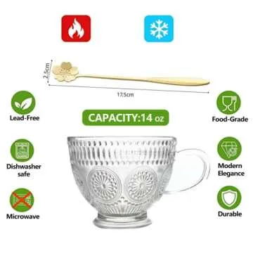 Show moreIndulge in the elegant charm of the LMTNNB Vintage Coffee Mugs Set, crafted to transform your daily coffee ritual into a stylish experience. This delightful set includes two beautifully designed 14-ounce glass mugs adorned with a stunning sunflower pattern and intricate mandala-like borders. With each sip from these generously sized mugs, you’re guaranteed more time enjoying your favorite beverages — be it steaming coffee, rich lattes, refreshing teas, or even cereals and yogurt. Their classic mug shape and delicate round curved handles ensure a comfortable grip, allowing you to savor every moment.