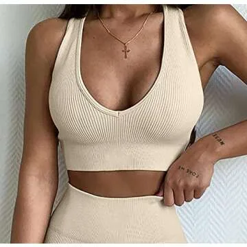 LNSK Women 2 Piece Workout Set Seamless Super Soft Ribbed Deep V Neck Bra Gym Shorts Sports Suit Yoga Outfits Beige
