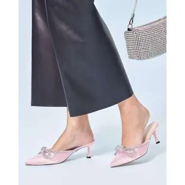 Show more Step into elegance with our stunning double bowknot rhinestone backless sandals. Designed with a heel height of approximately 2.4 inches, these closed pointy toe pumps combine style and comfort in one beautiful package. The soft footbed adds an extra layer of comfort, making them perfect for both day and night events. The classic low kitten heels not only elongate the legs but also offer an ideal balance, allowing you to dance the night away without any discomfort.