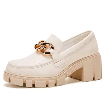 Show moreIntroducing the Loafers for Women Chunky Heel - a perfect blend of comfort, style, and functionality. Designed with a sleek patent leather upper and a chic chunky platform low block heel that stands at 2.55 inches (6.5CM), these loafers are not just shoes; they are a statement piece. Enhanced with a bold metallic gold chain, they bring a modern update to the classic penny loafer, offering elegance and flair that is sure to catch attention. The slip-on design ensures an effortless experience, allowing you to put them on and take them off with ease, making them a perfect accessory for your busy lifestyle.