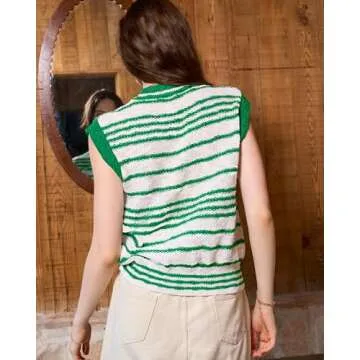 Locachy Womens 2024 V Neck Cap Sleeve Striped Sweater Vest Button Down Sleeveless Knit Tank Tops Green L