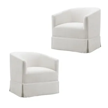 Show more Transform your living space with the exquisite Locus Bono Swivel Accent Chair Set of 2, a perfect embodiment of modern elegance and practicality. Crafted for those who appreciate style and functionality, these chairs are upholstered in high-quality linen-style fabric that not only exudes a sleek, contemporary vibe but is also durable for extensive use. The chairs’ distinct barrel design features a kick-pleated skirt that adds a touch of sophistication and a streamlined sculptural form that makes them a standout piece in any room. Ideal for compact spaces, the chairs measure 28"W x 27.5"D x 28"H, making them a perfect fit for your living room, bedroom, family room, or even your office.