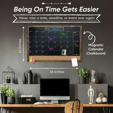 Show more Transform your space with the magic of organization using this exquisite 24x36 rustic chalk calendar board from Loddie Doddie. Designed to enrich your home or office, this chalkboard wall calendar is not just a planning tool; it's an artistic canvas that allows you to capture your thoughts, reminders, and creative expressions all in one sleek platform. With a grainy texture, it wipes clean effortlessly, ensuring a fresh start each month without any ghosting or staining. Get ready to embrace your to-do lists, seasonal art projects, and important dates like never before!