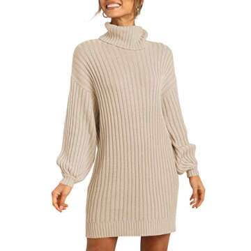 LOGENE Women's Sweater Dress Turtleneck Long Balloon Sleeve Ribbed Knit Oversized Pullover Dresses (Beige, S) 240-xingse-S